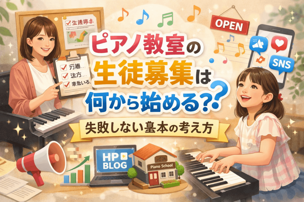 ピアノ教室を始めると、「やっぱりホームページは作ったほうがいいのかな?」と悩む先生はとても多いです。 周りを見ると、立派なホームページを持っている教室もあり、自分も作らなければいけない気がしてしまいますよね? でも、結論から言うと、必ずし... -