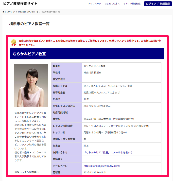 ページを開いた瞬間に目に入るため、一番最初にあなたの教室を見てもらうことができて、とても見つけてもらいやすいです。